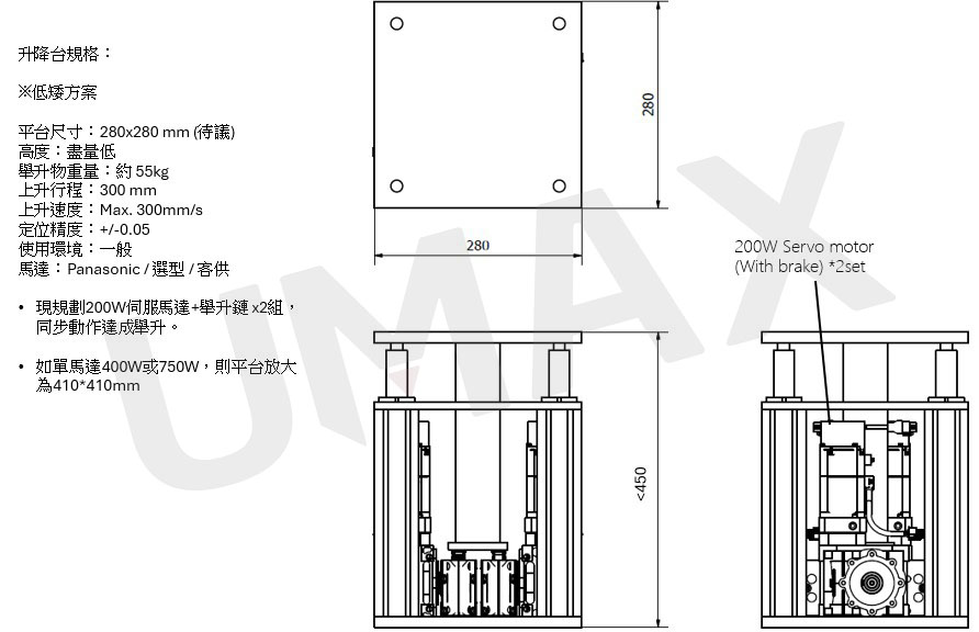 • 如單馬達400W或750W,則平台放大為410*410mm